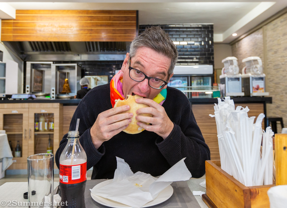 Thorsten tucking into his beef shawarma pita.I went for the chicken laffa again. I asked for way too many toppings and I almost felt like I would explode when I finished.