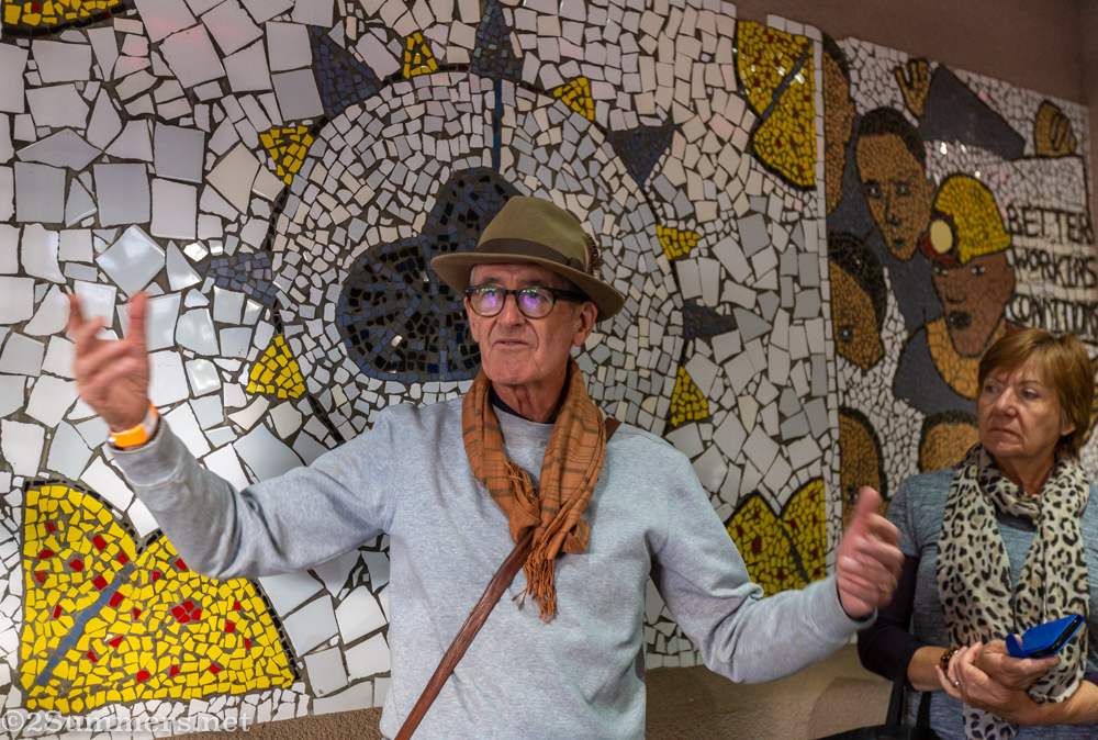 Eric Itzin, Head of Heritage for the City of Johannesburg and leader of the tour, explains the background of the NUM mosaic.My favorite panel.Stephen Faulkner, a former South African union leader and good friend of Drew, spoke passionately about Drew’s legacy as an artist and activist.