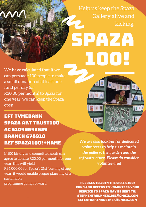 If you’d like to help keep Spaza Art Gallery’s legacy alive, please consider contributing to the Spaza 100 Fund. Spaza is looking for 100 people to donate as little as R1/day – R30/month, which is less than $2 – to keep the gallery running for a year (and beyond). The details are here: