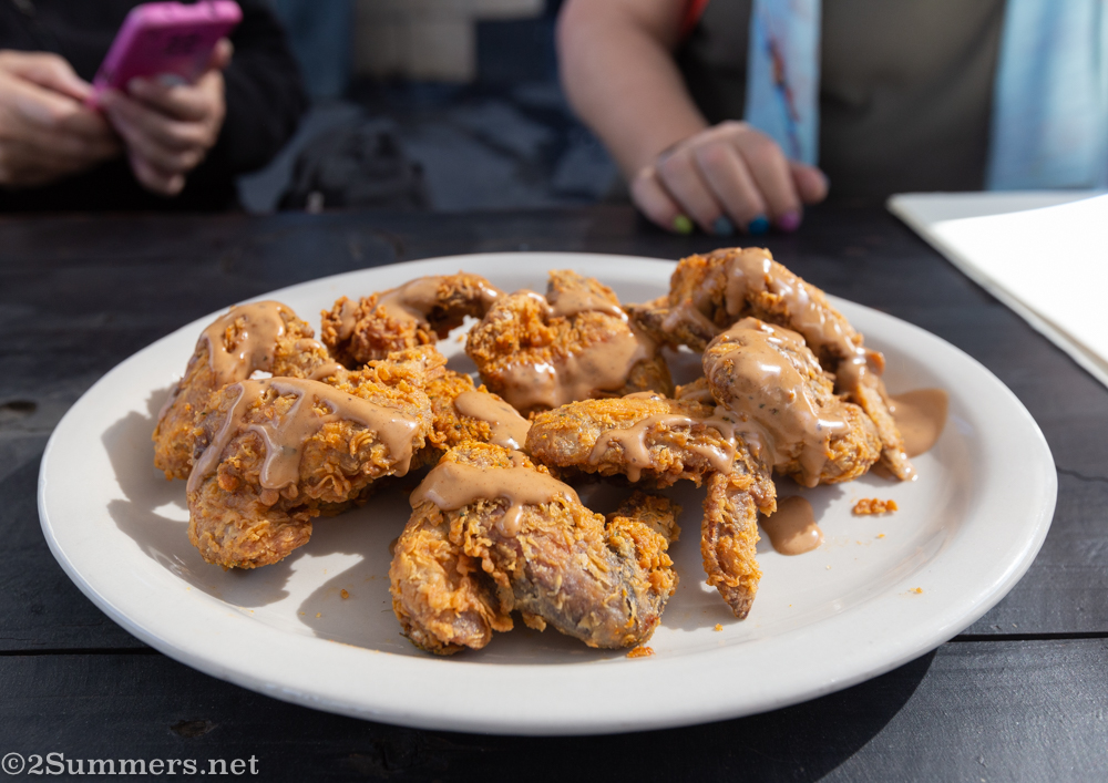 The spread of food you see here is the Junk Park’s "Small Boy Special", which includes enough chicken burgers, chips (fries) smothered in four different sauces, and onion rings to feed about a dozen large boys.We sampled the Junk Park wings, which were very tasty (although we waited a long time for them). The crust really melts in your mouth – my friend Gail says the coating is probably made with Toasties corn flakes.