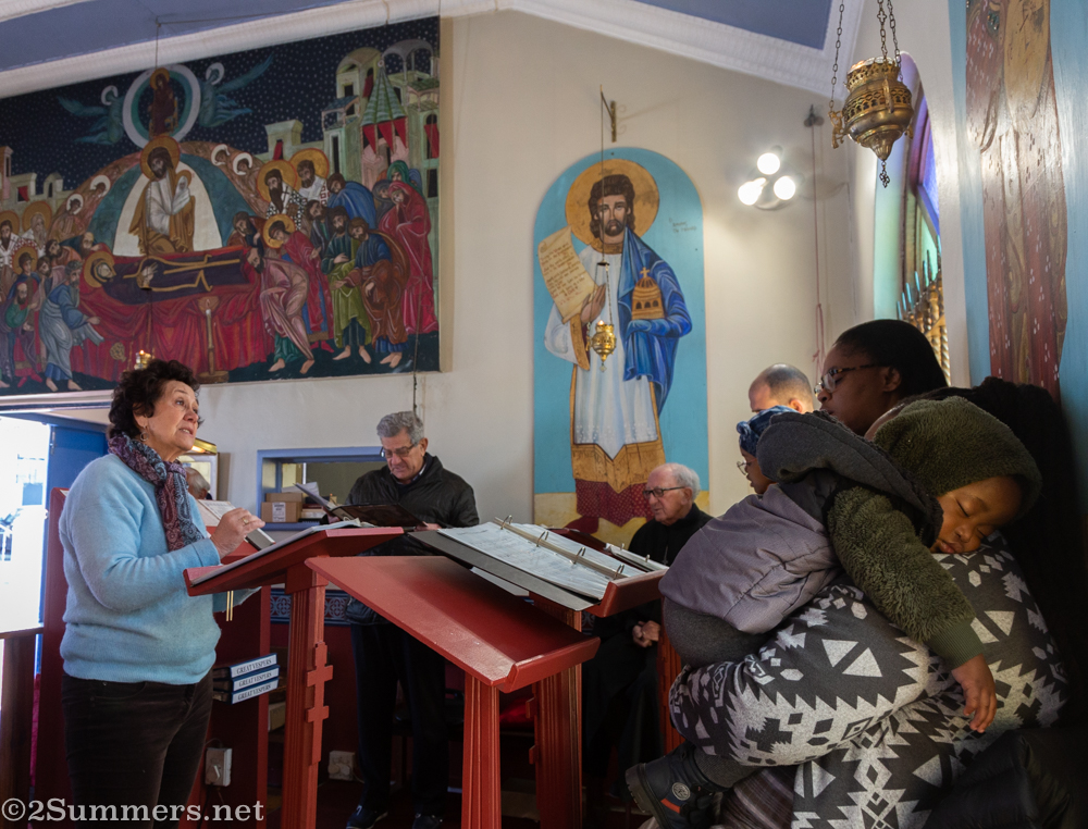 The St. Nicholas choir performs a cappella in four-part harmony. The choir director, Georgia Jammine, has been leading the choir since the church started 35 years ago.