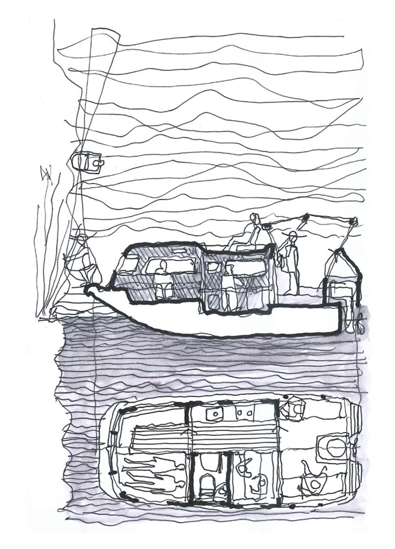 I spent a lot of time relaxing on the upper deck (roof) of the boat.Thorsten’s upper deck sketch.