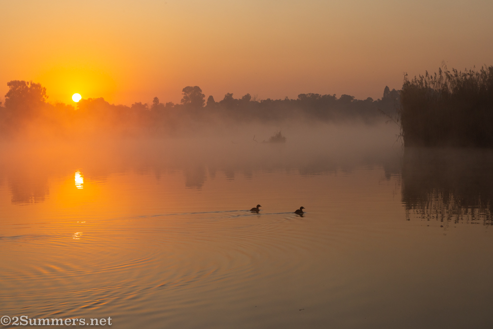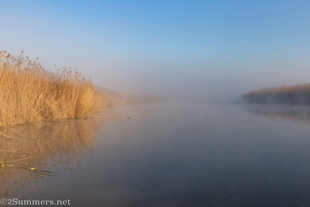 We drove far up this spruit (stream) off the river and anchored in a really isolated spot – halfway between the R57 Highway overpass and the Sasolberg Gas Engine Plant – because we didn’t really have time to go anywhere else at that point. I was slightly nervous, as we were far from civilization and if someone decided to attack us there was really nothing we could do. But no robbers came, and the spot turned out to be totally beautiful and romantic.Chilling in the reeds near Sasolberg.A reedy Sasolberg sunset.A very misty sunrise.