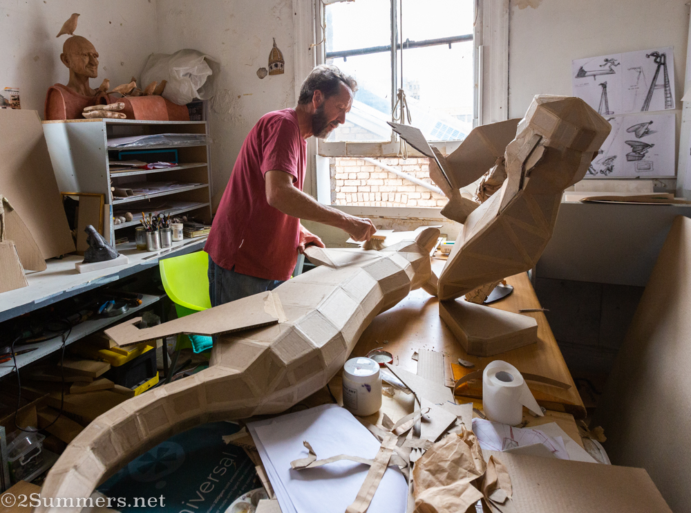 Alastair Findlay in his Lilian Road studio. Alastair is a cartoonist turned fine artist, currently making all kinds of Joburg-inspired art. He’s currently working on a series of sculptures inspired by Fordsburg.Cardboard Fordsburg man and cat.