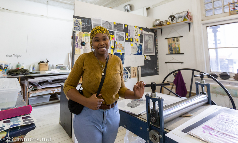Fiver’s studio is a collective of sorts, with several other artists using the studio to make prints and show their work. This is Kelebogile Masilo with some of her recent prints.Kelebogile with Fiver’s printing press. Read more about print-making in this post.
