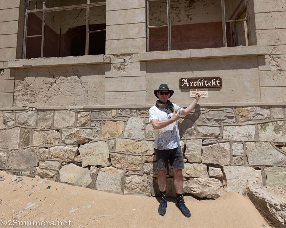 Rickety wooden planks, presumably positioned to discourage people from visiting a room with a collapsing ceiling.Hello.I couldn’t resist this opportunity to sit in a ghost town bathtub. (Photo: Thorsten Deckler)Thorsten outside his favorite Kolmanskop house – the architect’s house.@theThinking_Hand’s sketch of the architect’s house.There weren’t many other tourists there, and we were alone in our explorations most of the time. Occasionally we bumped into one or two other people.