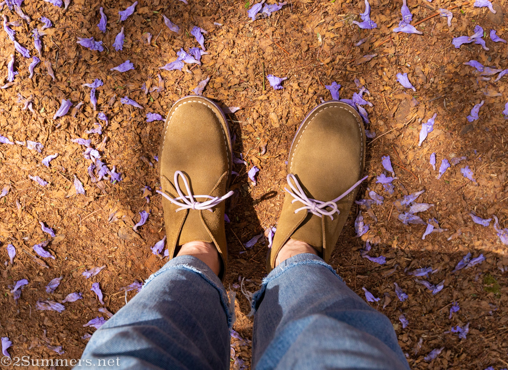 For some reason I never got around to buying any of those small-town vellies; I only acquired my own pair last October during the 2022 #JacarandaInYourPocket campaign. As one of the campaign’s tour leaders, I received a pair of purple-soled vellies from Veldskoen®, a popular South African company marketing vellies in a number of cheerful colors.