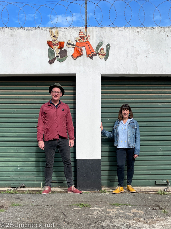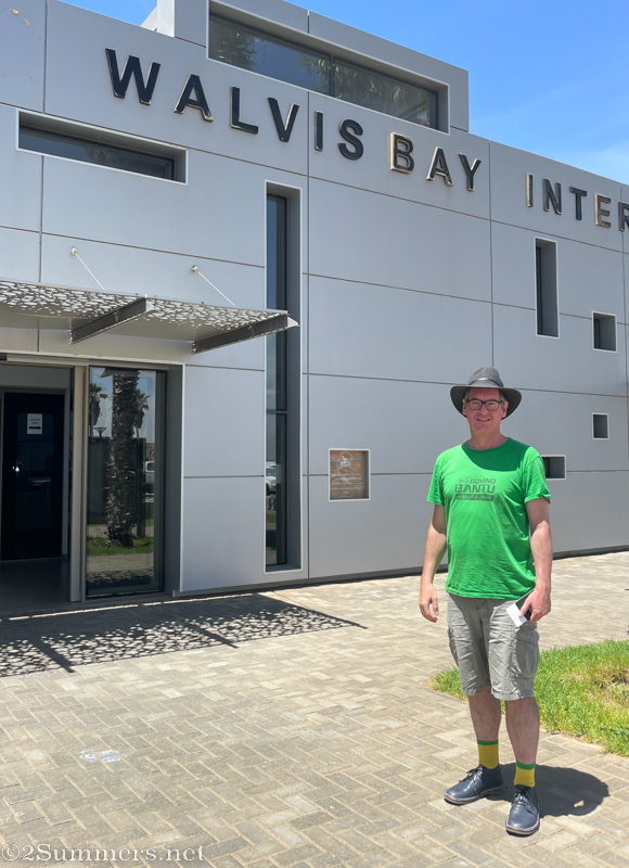 Just a few of the colorful veldskoens for sale at Vellie Valley in Swakopmund.Thorsten sporting his new blue vellies on our way out of Namibia.