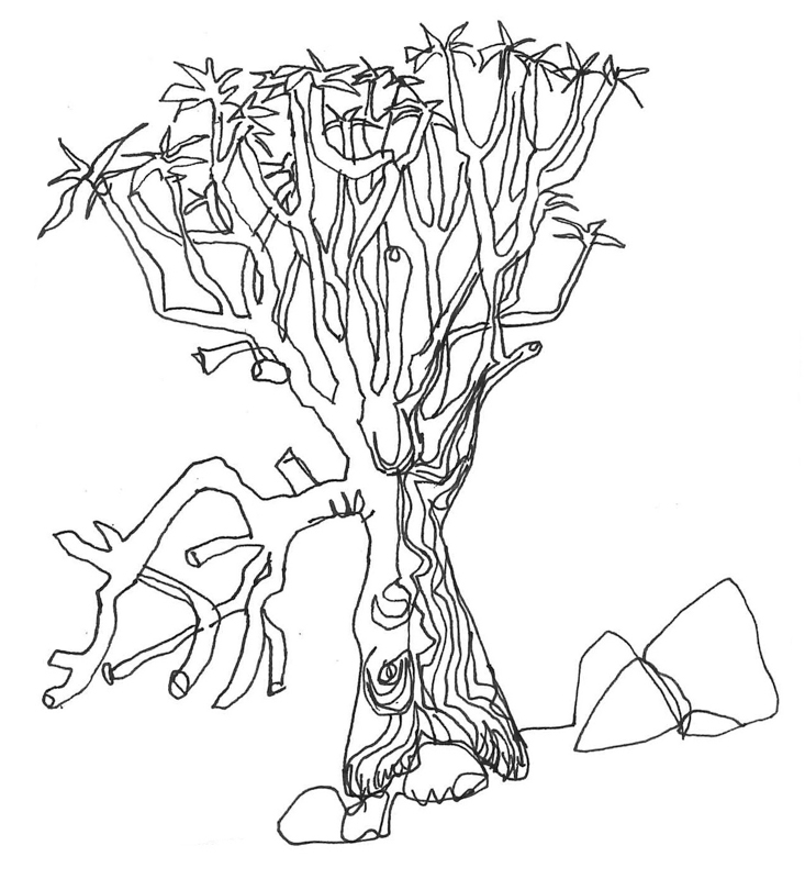 An old car on the Eureka Farm, which apparently broke down on its maiden voyage more than 50 years ago and hasn’t moved since.WHAT?!? A mountain we climbed on the Eureka Farm.Seriously…WHAT?!?! Andrew and his friend Owen walking on the summit of the mountain. It was so stunning and surreal, I could hardly breathe. My photos don’t at all capture the way it actually looked.A Eureka Farm sketch by @TheThinking_Hand.We climbed really high and it was hot. The skin on my arms broke out into a disturbing, sun-related rash. Eventually I wised up and realized that white people (maybe all people) should wear long sleeves in the desert.Andrew’s Land Cruiser provided great foreground for my desert pictures.Andrew, Thorsten, and Owen at a potential lodge site on the farm.For years I have been wanting to photograph a quiver tree(kokerboomin Afrikaans), a critically endangered desert tree that grows only in parts of South Africa and Namibia. I got my wish on this trip – there are hundreds of quiver trees on the Eureka Farm.I love the way Thorsten sketched the gnarly trunk.Quiver tree landscapes.Quiver tree lovers.Two beautiful horses playing on Eureka Farm. These are not wild horses – Andrew owns them.The wild horses do, however, graze very close to the Eureka Farm. Here are two of them.Andrew at the wild horses’ watering hole, which is close to the farm. Read more about the wild horses.