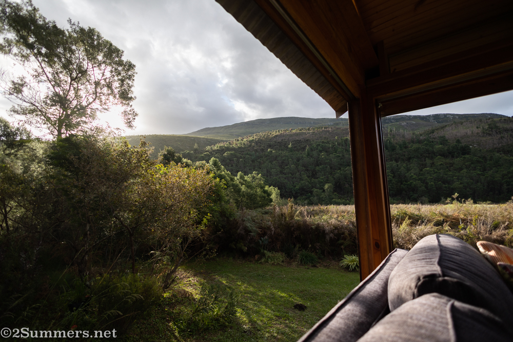The Timber House folds nicely into the wooded area behind it. There’s a swimming hole beside the house for hot summer days. The front of the house faces north toward the Langeberg mountain range and the sound of tumbling waterfalls.