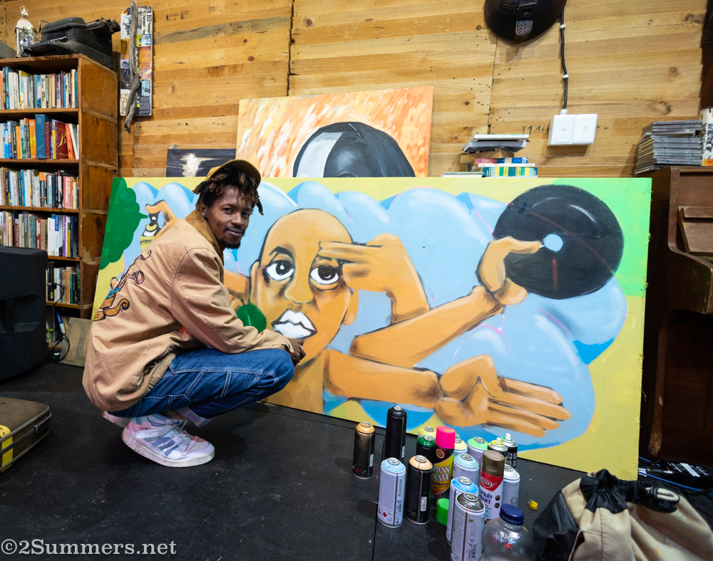 The outside of the old power plant.The side of the plant. It took us a few minutes to wander around to the back and find the entrance to the Black Power Station.Here’s what we eventually found.X Madinda, founder and CEO of the Black Power Station, in the reading area. This corner is often used for book readings and launches.Graffiti artist Tolo Likakheswa, a.k.a. fal.kab, was finishing this canvas when we walked in.