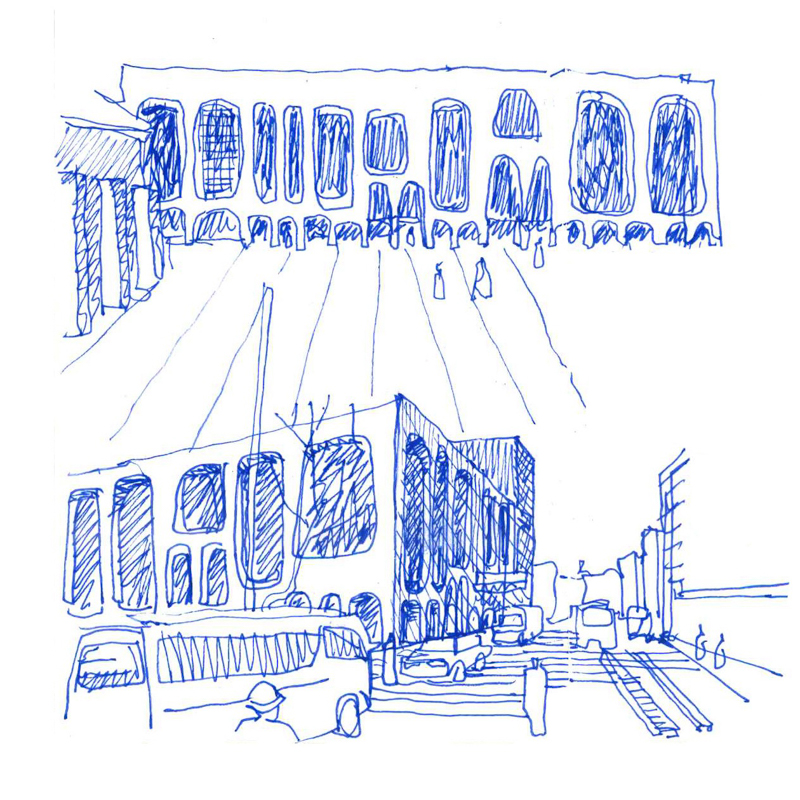 This square behind the Hall is a memorial to the 156 people accused in the Treason Trial. The names of all the people accused are carved into the pillars that line the square. The cool modern building across the square is the former Ster City Cinema.Thorsten’s sketches of the square, the Ster City Cinema, and surrounds. See more of Thorsten’s sketches at the @theThinking_Hand.