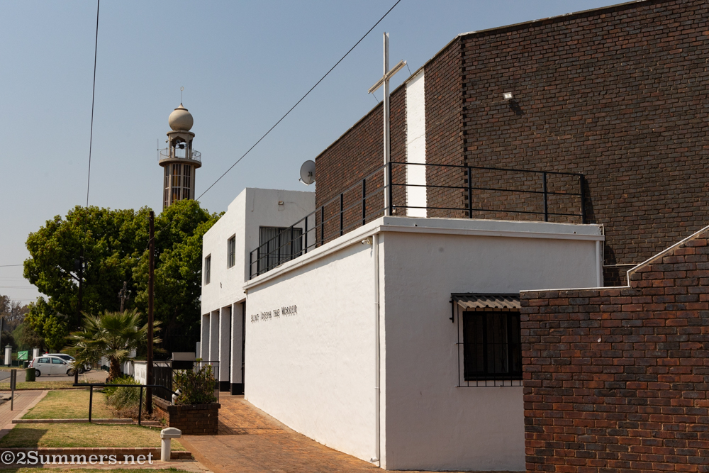 Looking at St. Jospeh the Worker with the mosque minaret in the background.Unfortunately I couldn’t get a head-on shot of the church because the bus was parked in front. But it’s a beautiful modernist building.Inside the nave of St. Jospeh the Worker. Note the gum poles in the ceiling, which seem to be a regular feature of Turgel-designed churches.Dazzling Stations of the Cross paintings.I love the curved shape of the pulpit.St. Joseph the Worker has two sculptures by the acclaimed South African sculptor Sydney Kumalo.I’m including this because I like the fact that Joseph the Worker is caring for Baby Jesus, and also because Jospeh is sporting pretty green eye shadow.
