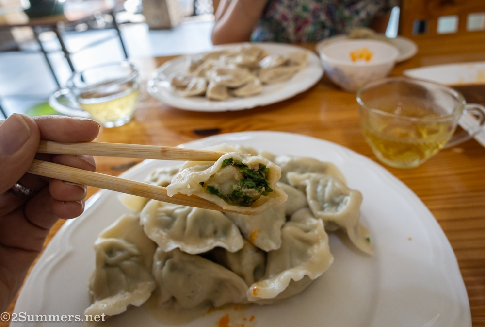 A huge plate of delectable dumplings (already partially eaten).Smashed cucumber with plenty of chili and coriander (cilantro).