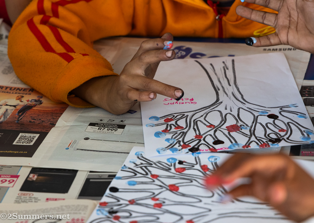 The new library is enormous.True to its name, Noordgesig’s library faces north. This balcony looks out over New Canada Road, one of the main arteries connecting Soweto to the rest of Joburg.The library’s lovely children’s section.Fabian and Lavinia, a talented artist and sign writer, were leading a youth art class at the library on the day I visited. (Monday was a school holiday.) The class was delightful and, as you can see, very well attended.Watching kids finger-paint is a relaxing and enjoyable activity. The kids also used recycled toilet paper rolls to paint flowers.Flower-painting contest winners.