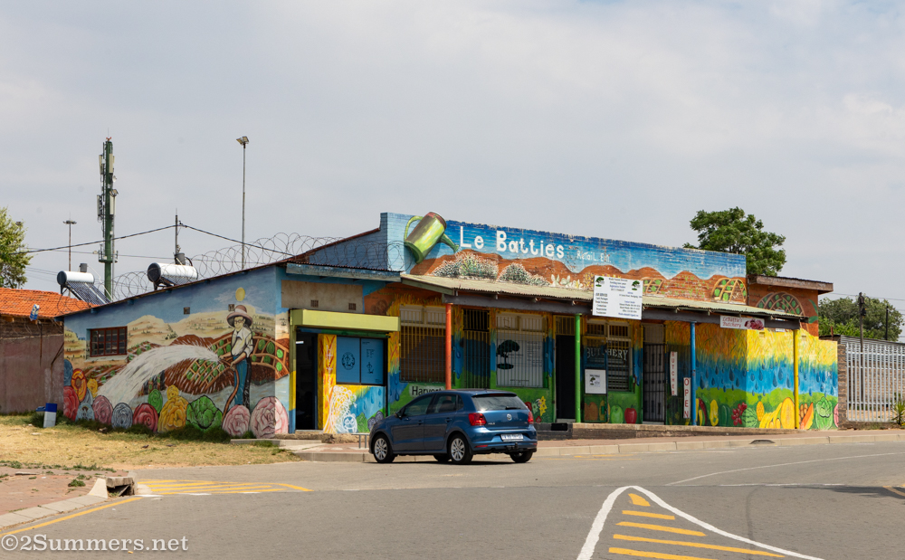 The other side of the community center features another Noordgesig scene.A beautiful mural honoring South African boxer Jake Tuli, who lived much of his life in the house across from Lavinia and Fabian’s current house.This mural also features Jake Tuli.A beautifully painted butchery and food shop. There’s a story about the lady painted on the side of the building – a local Noordgesig woman who was renowned for her gardening prowess. I’ll get the full story for next time.