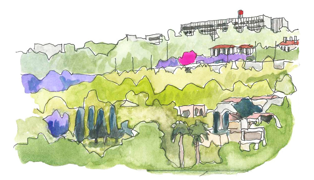Another shot of the view.One more Thorsten sketch of the view, featuring a shock of pink bougainvillea among the jacarandas.