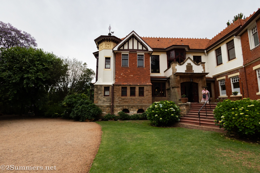 Last weekend Thorsten and I visited Dolobran, one of Joburg’s oldest, quirkiest, and most mysterious mansions, on a tour with the Johannesburg Heritage Foundation (JHF). Dolobran is unique among Joburg’s “Randlord” mansions (other examples of which include Villa Arcadia and the View) in that it’s privately owned, still occupied by descendants of the original owners, and almost never open to the public. Saturday’s tour was open only to JHF members and photography wasn’t allowed inside.
