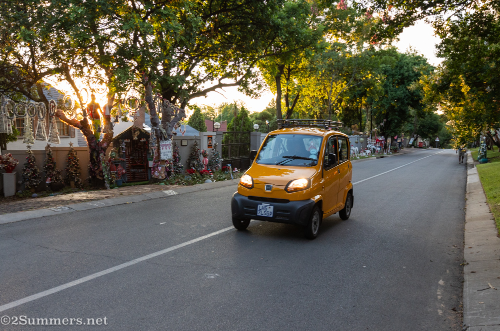 Like so many suburban Joburg streets, Moray Drive has no sidewalks. Dodging traffic as we admired the decorations made the experience more authentic.A string of Christmas Santas hanging by their hats. Cute or creepy? You be the judge.Decorations tacked to a spiked palisade fence protecting a bird sanctuary. So Joburg.