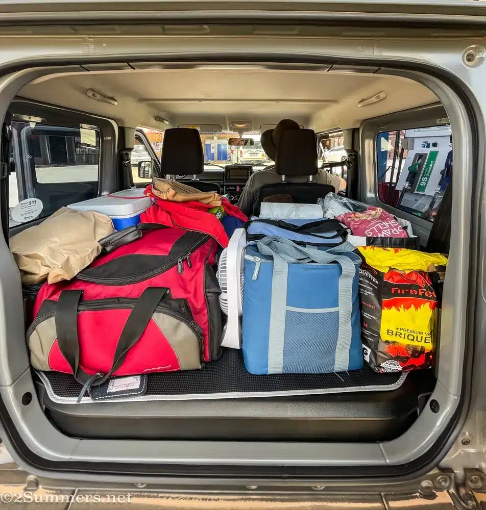 Kristen, Percy, and Sipho squeezed into the back of Greylene a few weeks ago when we went to the Stance Park Off at FNB Stadium. We managed to fit one small grocery bag of snacks back there with them.Greylene with the seats folded down, packed for a 10-day road trip.