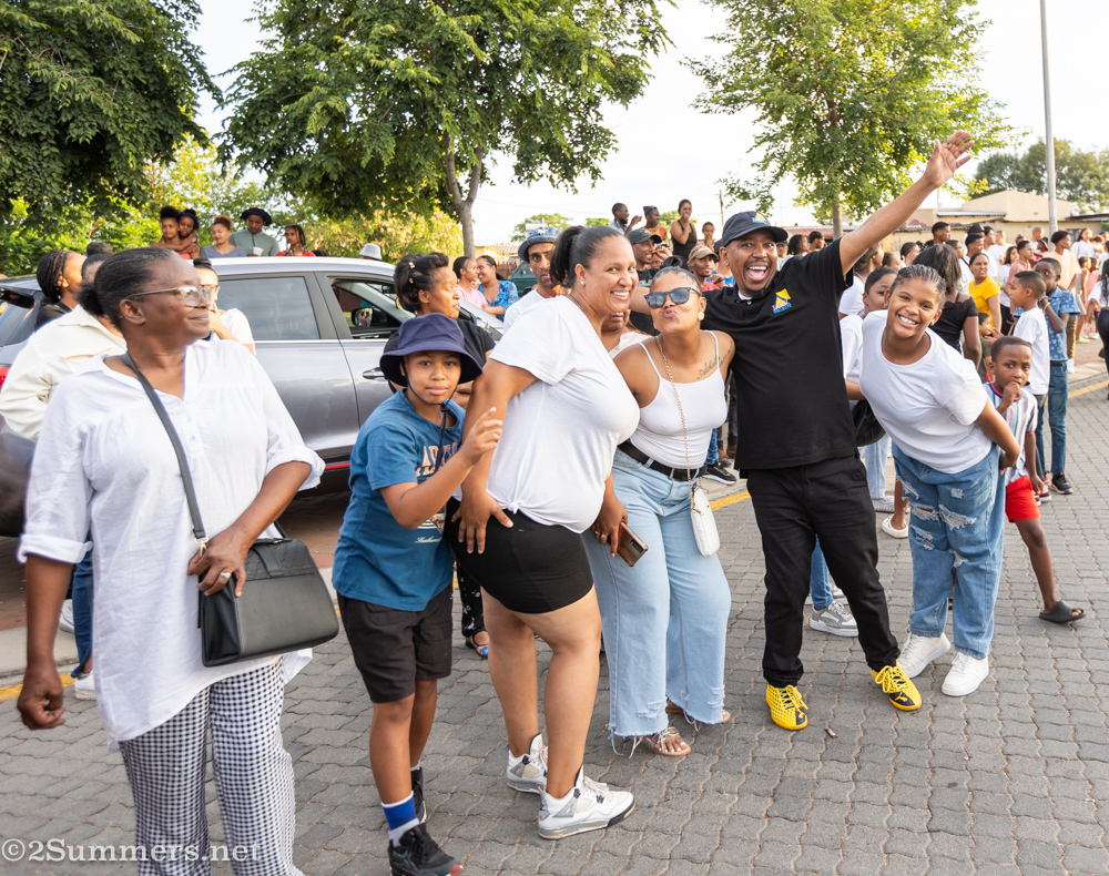 Micayla was not the only matric celebrating in Bulte that day. All the other matrics were having similar events at their own homes, and around 6:00 p.m. they were all taking off, as Micayla was, to go to the banquet. It’s an annual tradition for all of the matric farewell cars to parade around in Noordgesig’s main square before they leave, and the entire neighborhood comes out to see them off. So Fabian and I and a bunch of other family members hurried up to the square to catch the parade.