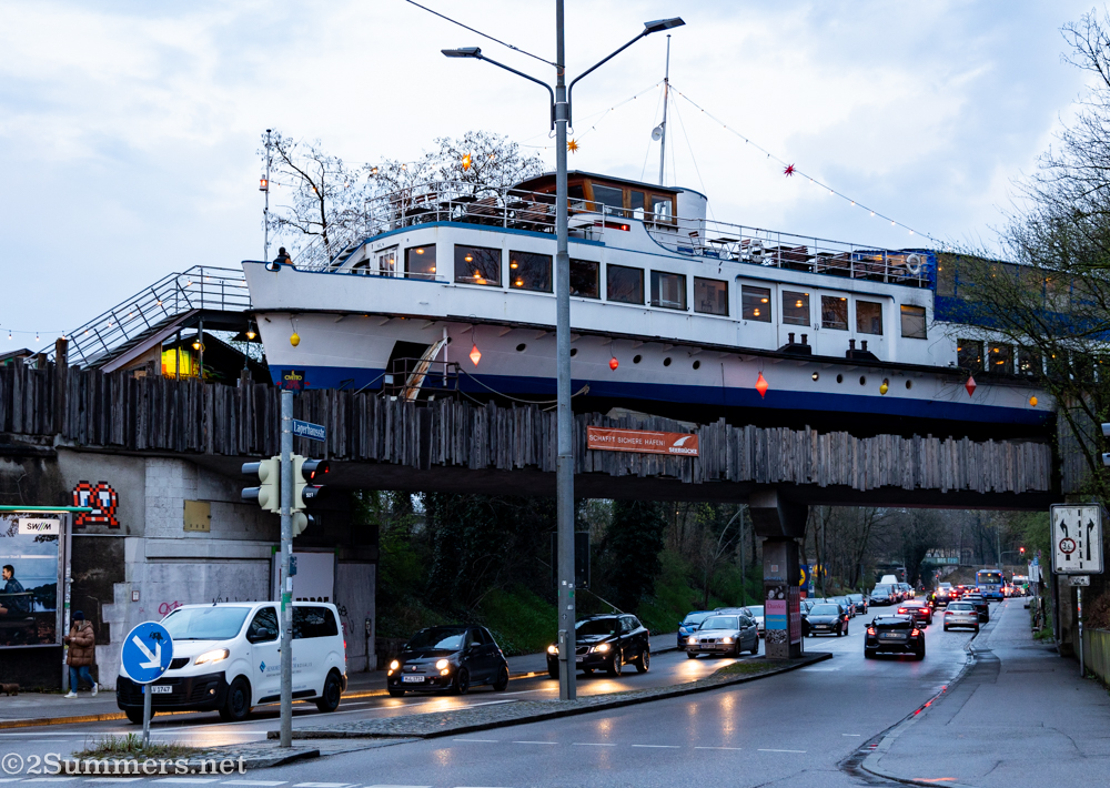 Thorsten peeling stickers from a graffiti’d building near the Isar River. Collecting graffiti stickers has become Thorsten’s favorite travel hobby after sketching.He puts the stickers into his sketchbook and makes cool collages like this.I like how the graffiti pieces are stacked on top of one another.A lonely building in Pullach, spotted during a cold, rainy walk near the river.Under the bridge.Can you spot the small, bretzel-shaped Space Invader hiding in this picture? And how cool is that quirky passenger-ship-turned-bar perched on a decommissioned railway bridge? It’s called Alte Utting and Susi took us there for a beer.Susi above the beer garden behind Alte Utting.Another retired transport vehicle at the fantastic Bahnwärter Thiel complex, which I mentioned briefly in my previous Europe post.A cool bar at Bahnwärter Thiel.