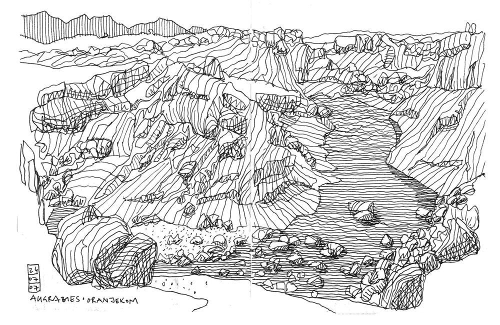 Our first glimpse of Augrabies Falls. There is a long maze of raised walkways and lookout points along the river here, so put on comfortable shoes and a hat before setting out.Falls sketch.