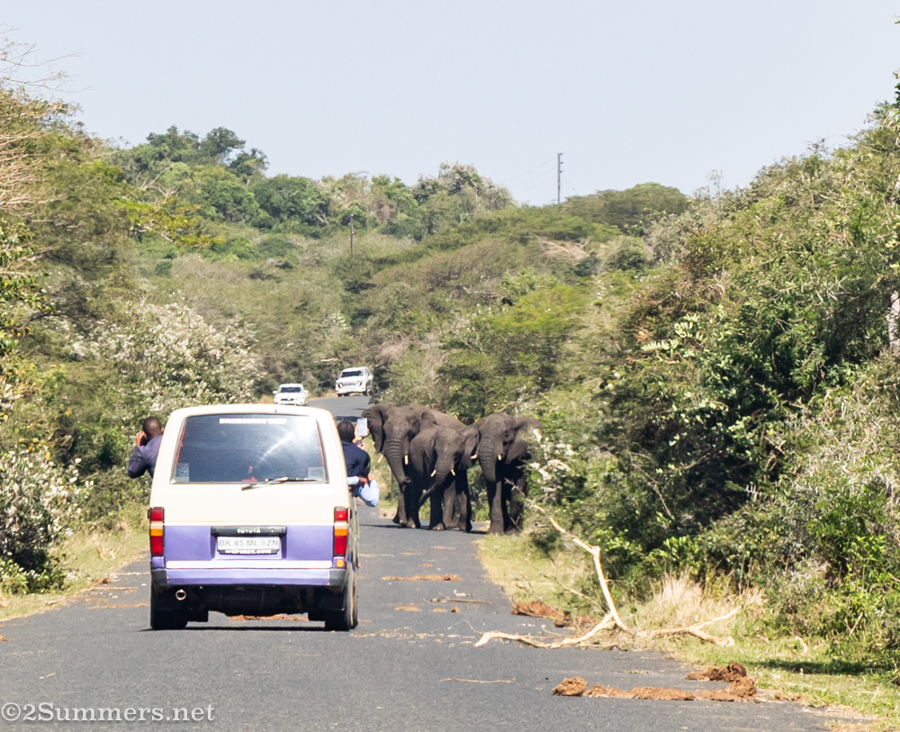 I forgot my long lens but did manage one okay shot of this trio of elephants. Apparently iSimangaliso’s elephants are known for their surliness and should be treated with caution (i.e., don’t do what the guys in that taxi up ahead are doing).